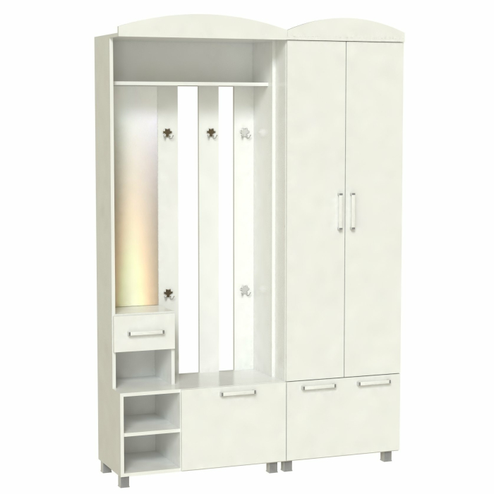 Корпус и фасады прихожей выполнен из Ламинированной ДСП высшего качества с насыщенным цветом. .Шириною 140 см., это небольшой комплект из двух модулей, тумбы-вешалки и шкафа. В шкафу две распашные двери и одна откидная. Во втором модуле небольшое, но высокое зеркальце над маленьким ящиком. Имеются три ниши рядом с откидной дверью. На вешалке пять двойных крючков. Прихожая Шк-7 самое лучшее решение и идеально подходит как для не больших помещений, так и для средних.¶