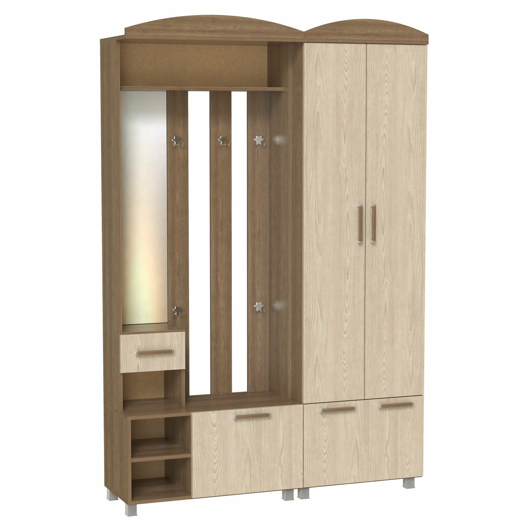 Корпус и фасады прихожей выполнен из Ламинированной ДСП высшего качества с насыщенным цветом. .Шириною 140 см., это небольшой комплект из двух модулей, тумбы-вешалки и шкафа. В шкафу две распашные двери и одна откидная. Во втором модуле небольшое, но высокое зеркальце над маленьким ящиком. Имеются три ниши рядом с откидной дверью. На вешалке пять двойных крючков. Прихожая Шк-7 самое лучшее решение и идеально подходит как для не больших помещений, так и для средних.¶