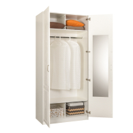 Горизонтальная штанга для одежды на вешалках, четыре ниши для вещей и большое зеркало на внутренней стороне дверцы - всё продуманно!