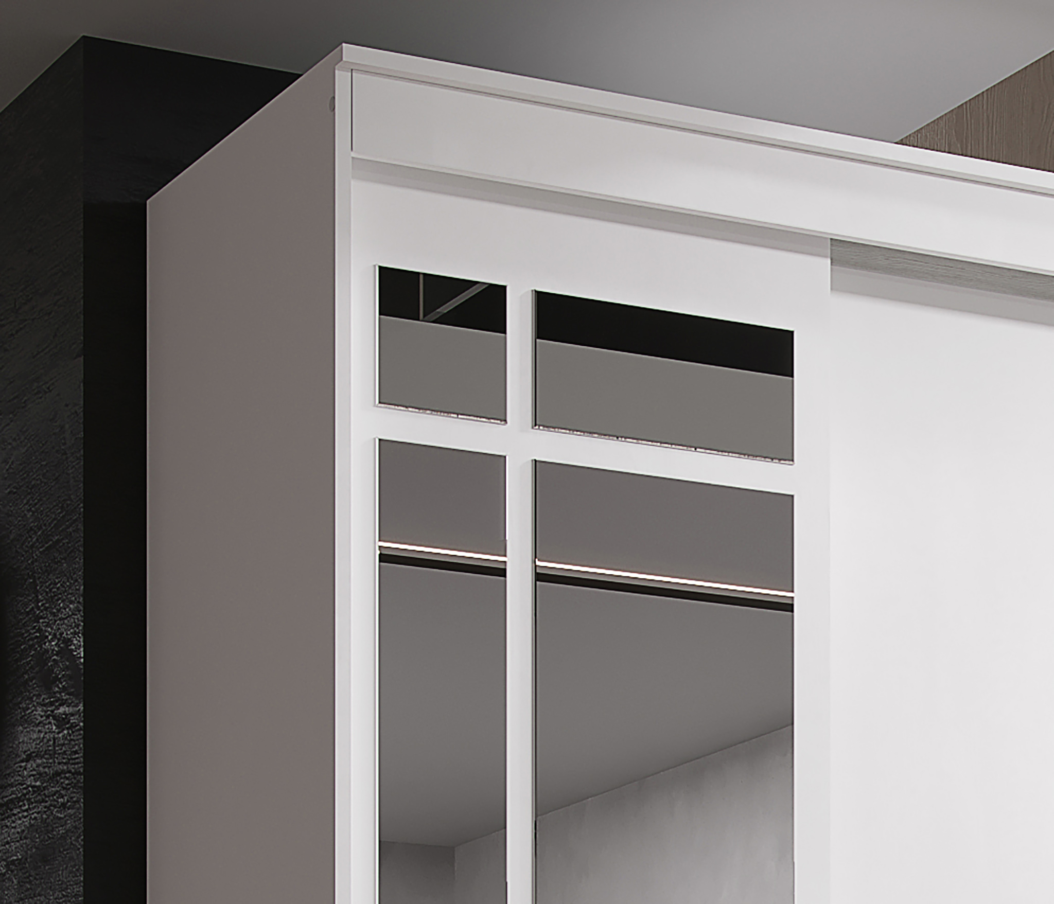 Содержит отдел с антресольной полкой и штангой для вешалок, отдел с полками, два выдвижных ящика и отдел с двумя штангами для вешалок. Зеркала входят в комплект. Материал ЛДСП, кромка ПВХ, зеркало