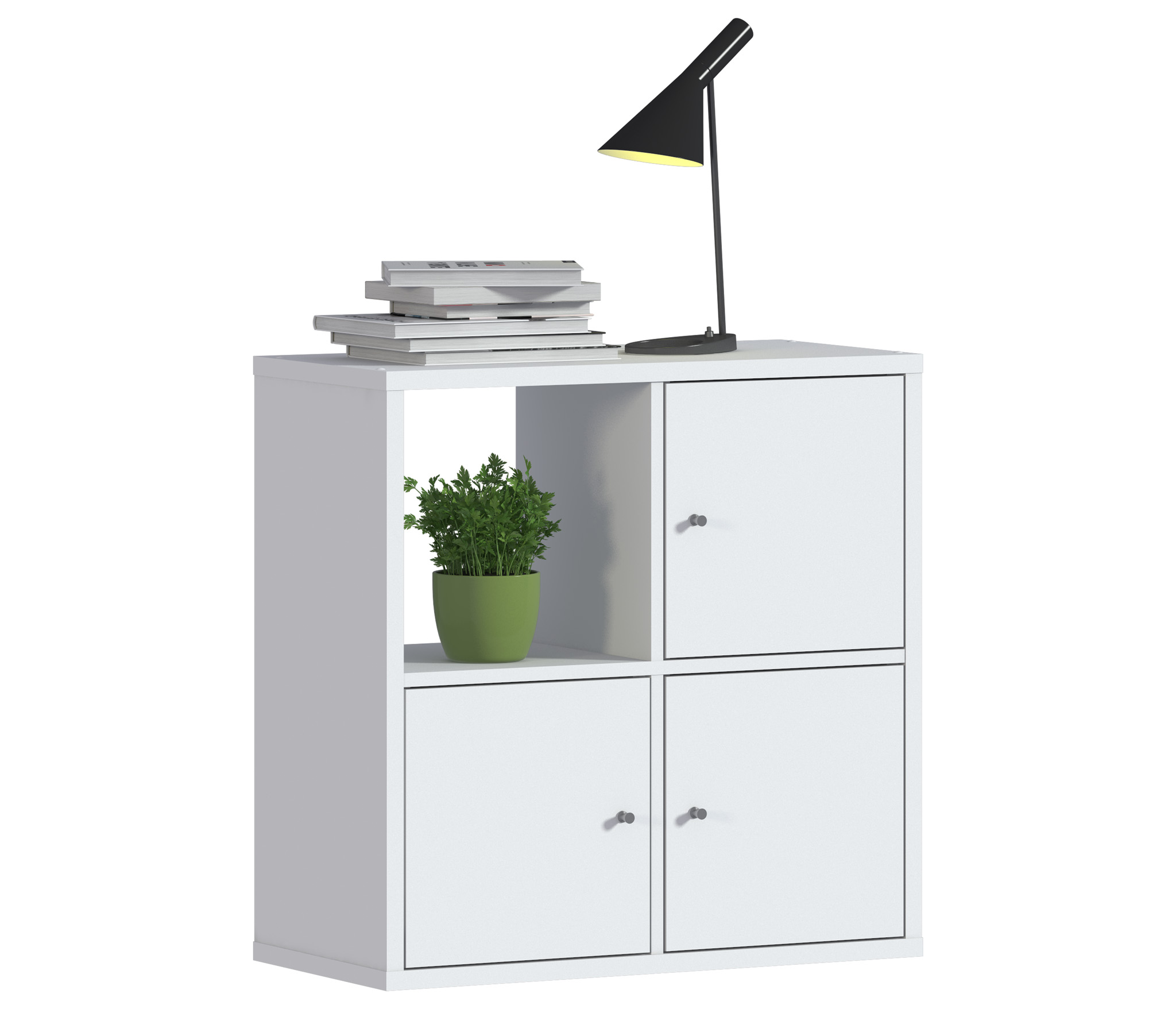 Габаритные размеры – ширина 71 см, высота 71 см и глубина 34 см. Конструктивно стеллаж представляет собой четыре отделения. Выполнен стеллаж из современного и прочного КДСП в белом цвете. Стеллаж идеально подойдет для оформления кабинета, гостиной, детской, спальни и даже прихожей в современном стиле.