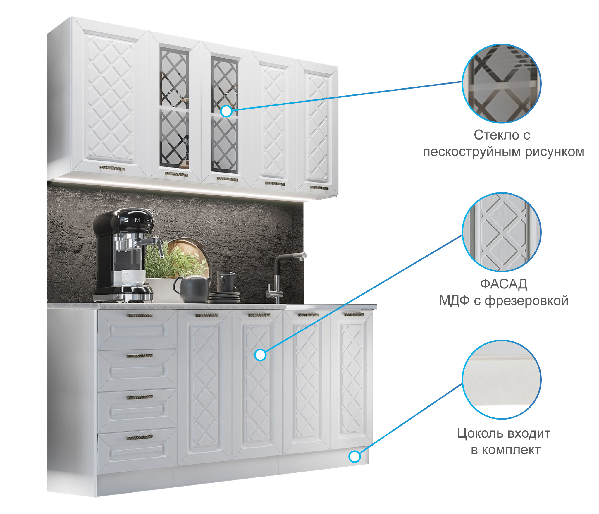 Глубина верхних и нижних шкафов указана с учетом фасада.