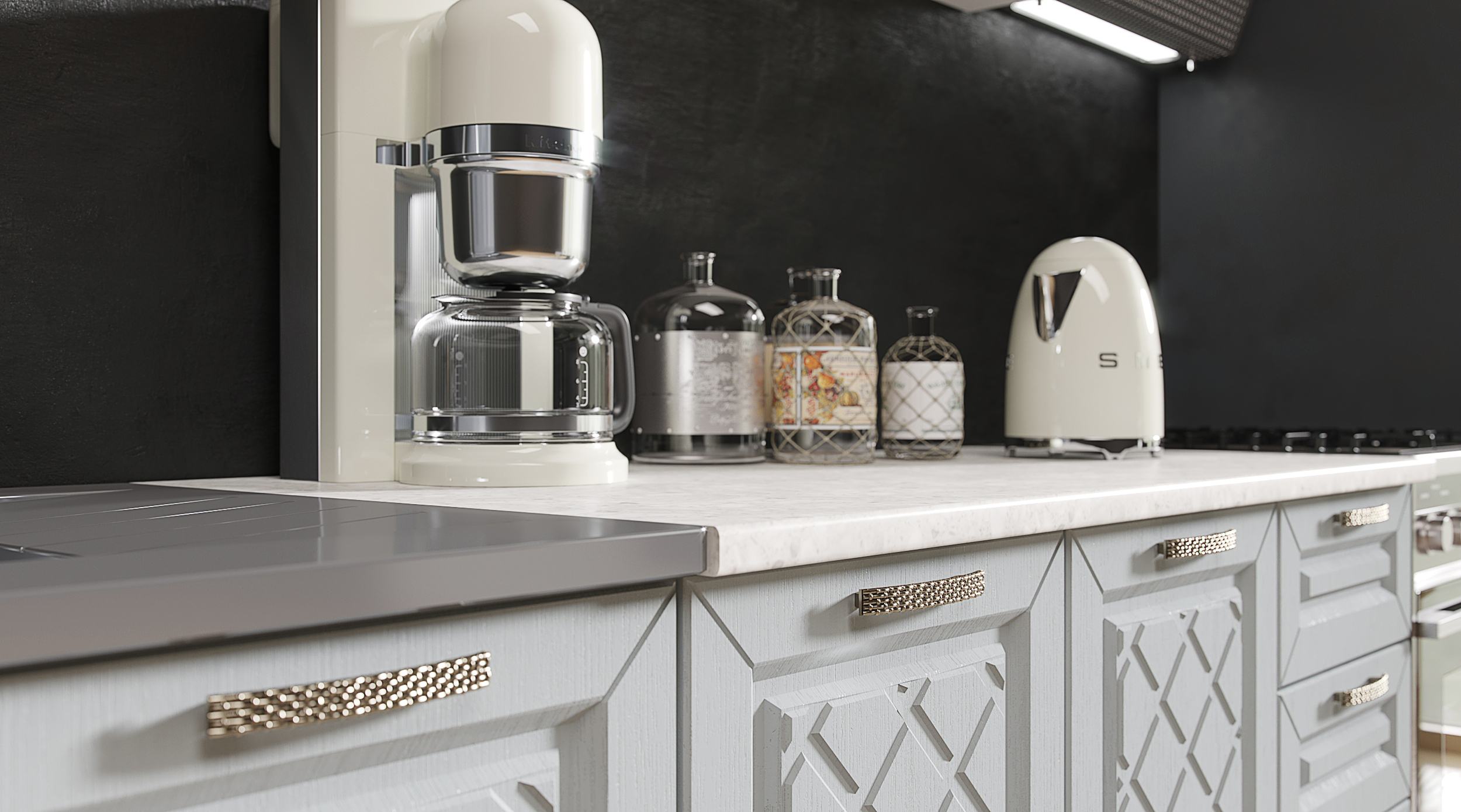 Кухня Агава- изящный гарнитур с фрезеровкой по фасаду и матовыми стёклами.