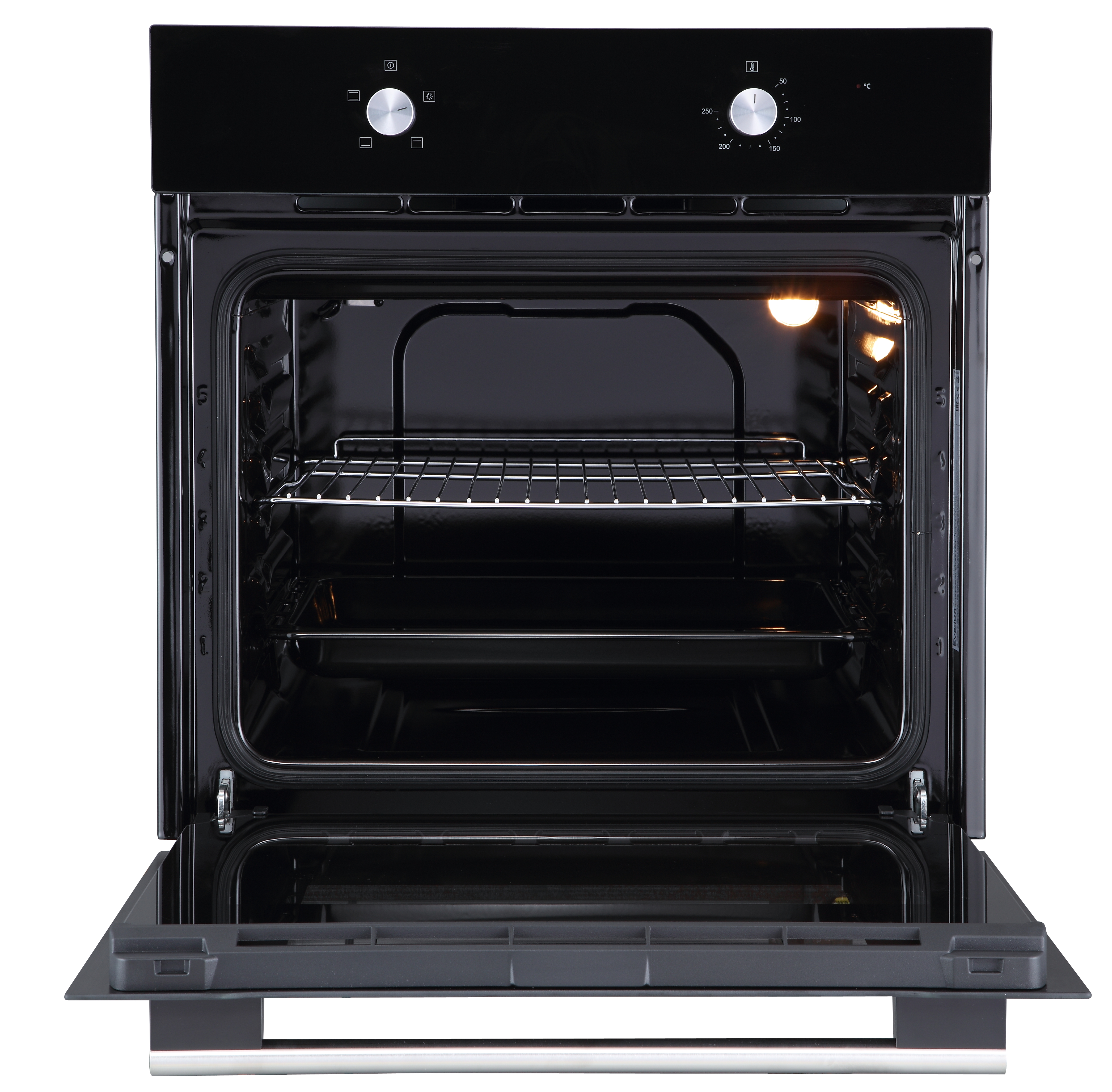 Электрический духовой шкаф встраиваемый полноразмерный, 60 см, механическое управление, 4 режима, объем духовки 65л, поворотные переключатели, панель управления - черное стекло, универсальный противень, решетка-гриль, двойное стекло дверцы, легко-съемное большое внутреннее стекло Full Glass, защитное отключение, охлаждающий вентилятор, 595х575х595 мм.