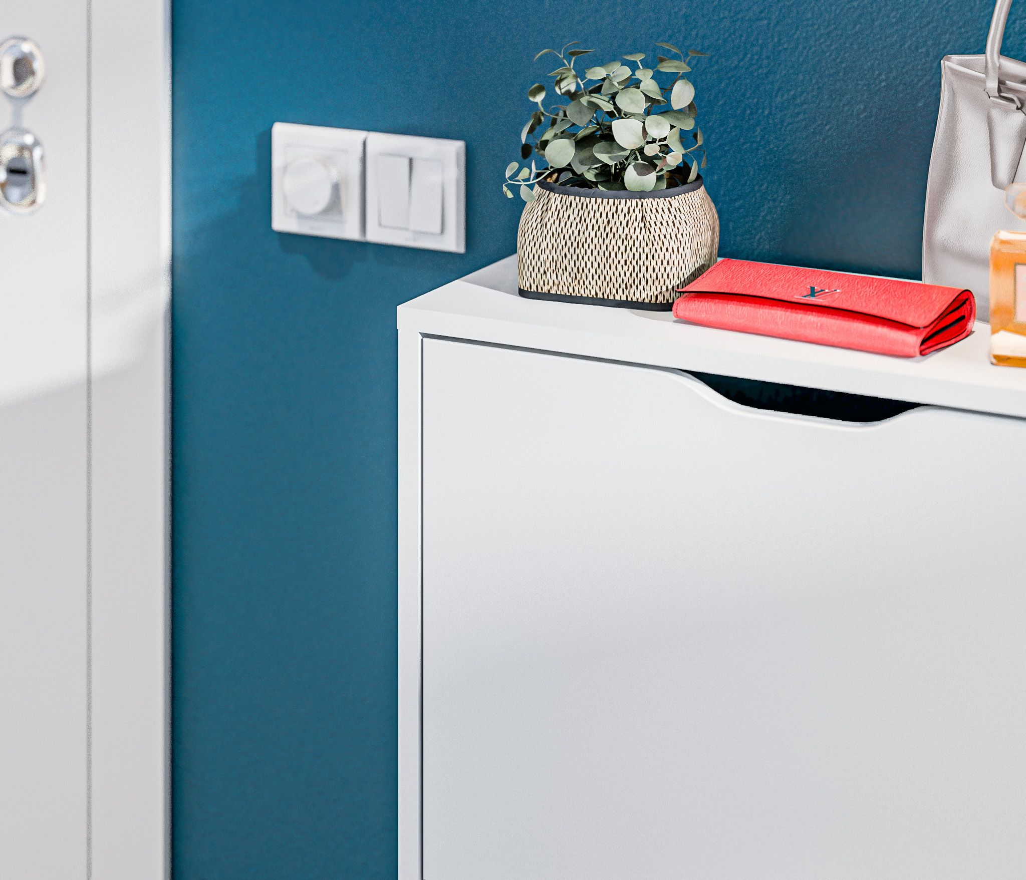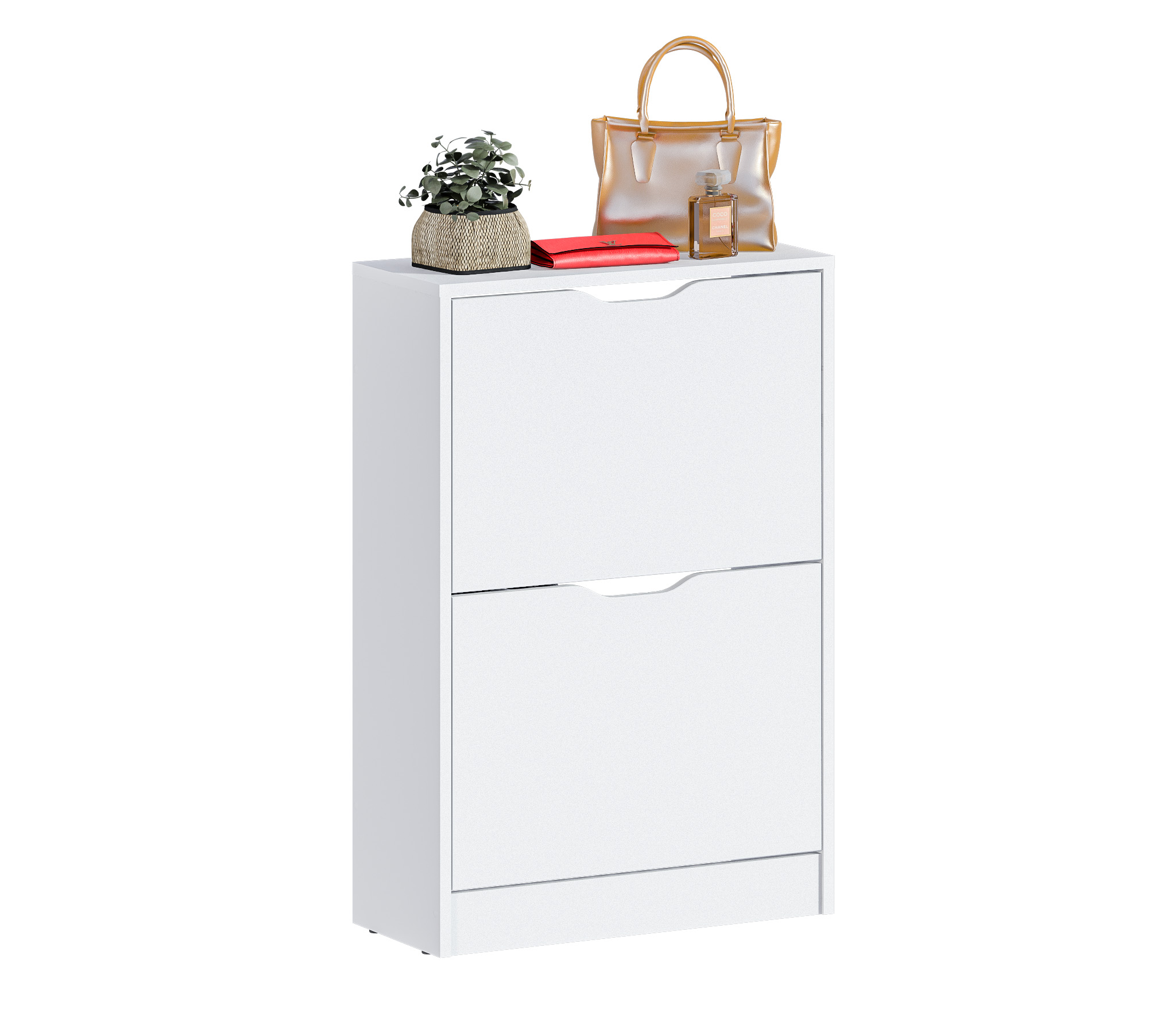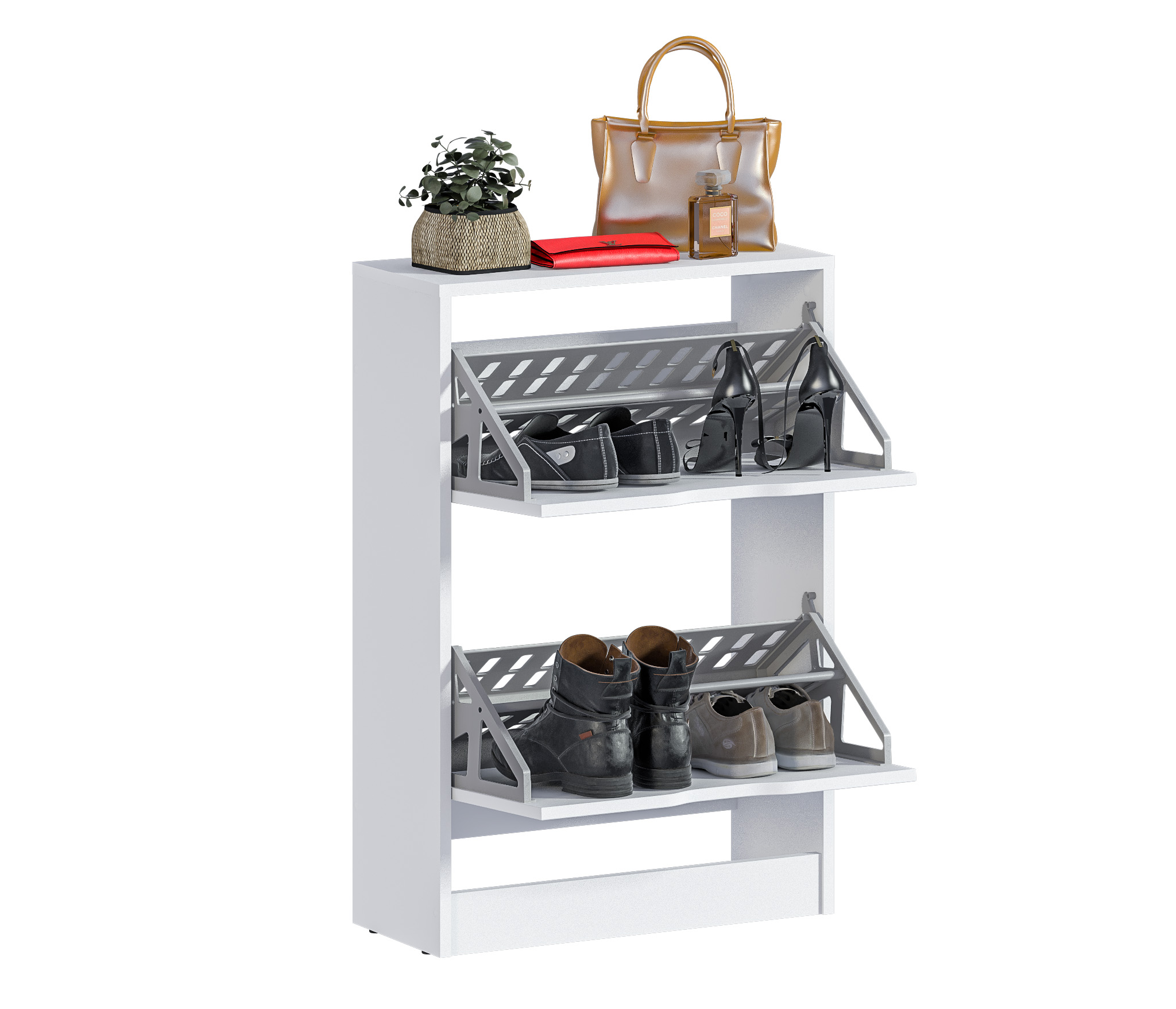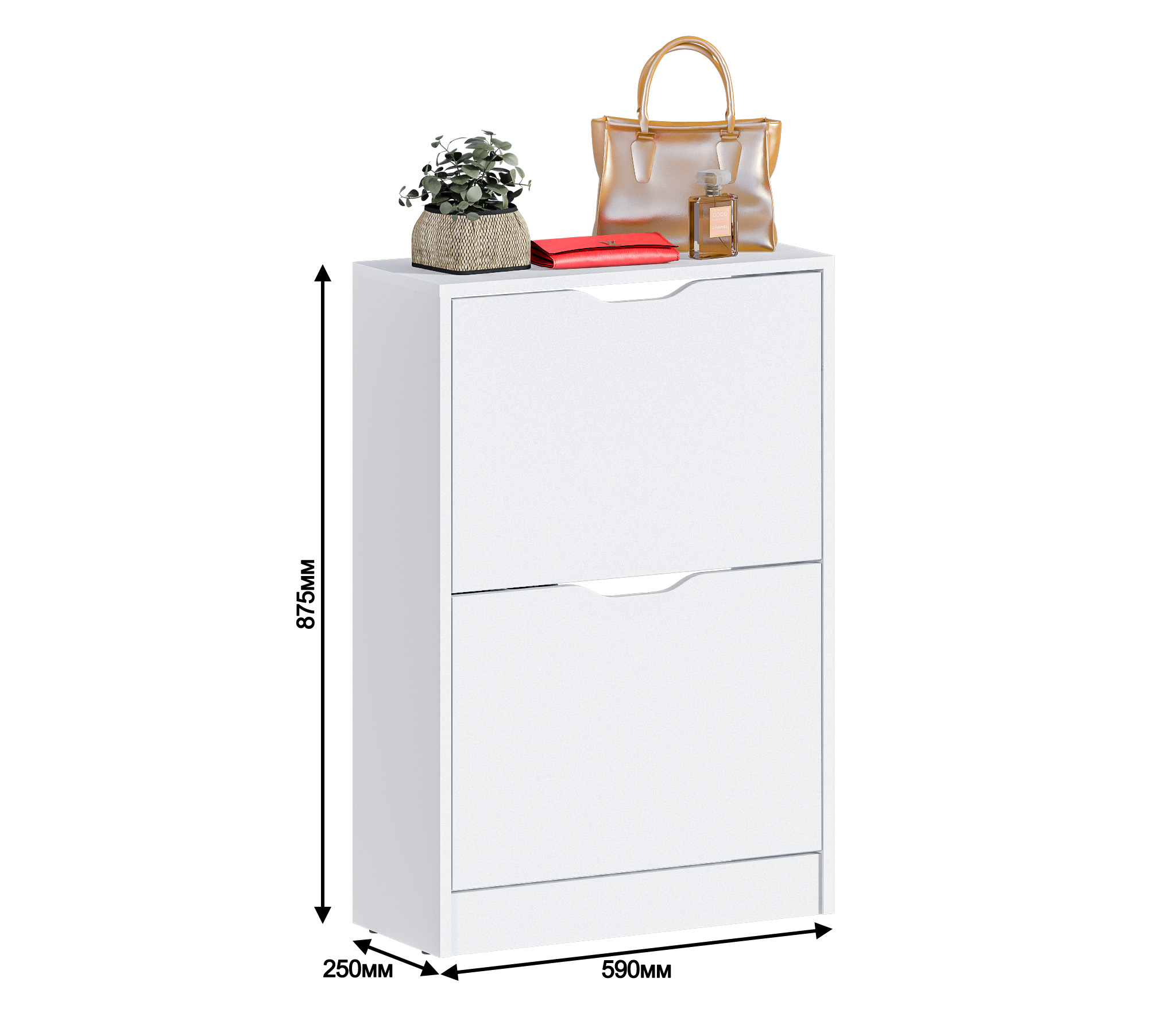 Габаритные размеры – ширина 59 см, высота 87 см и глубина 25 см. Обувница имеет два отделения, каждое из которых оснащено специальными стойками для хранения обуви. Прорезные ручки и строгие геометрические формы позволяют вписать обувницу в любой интерьер. Обувница произведена из экологичного прочного КДСП, устойчивого к мелким механическим повреждениям.