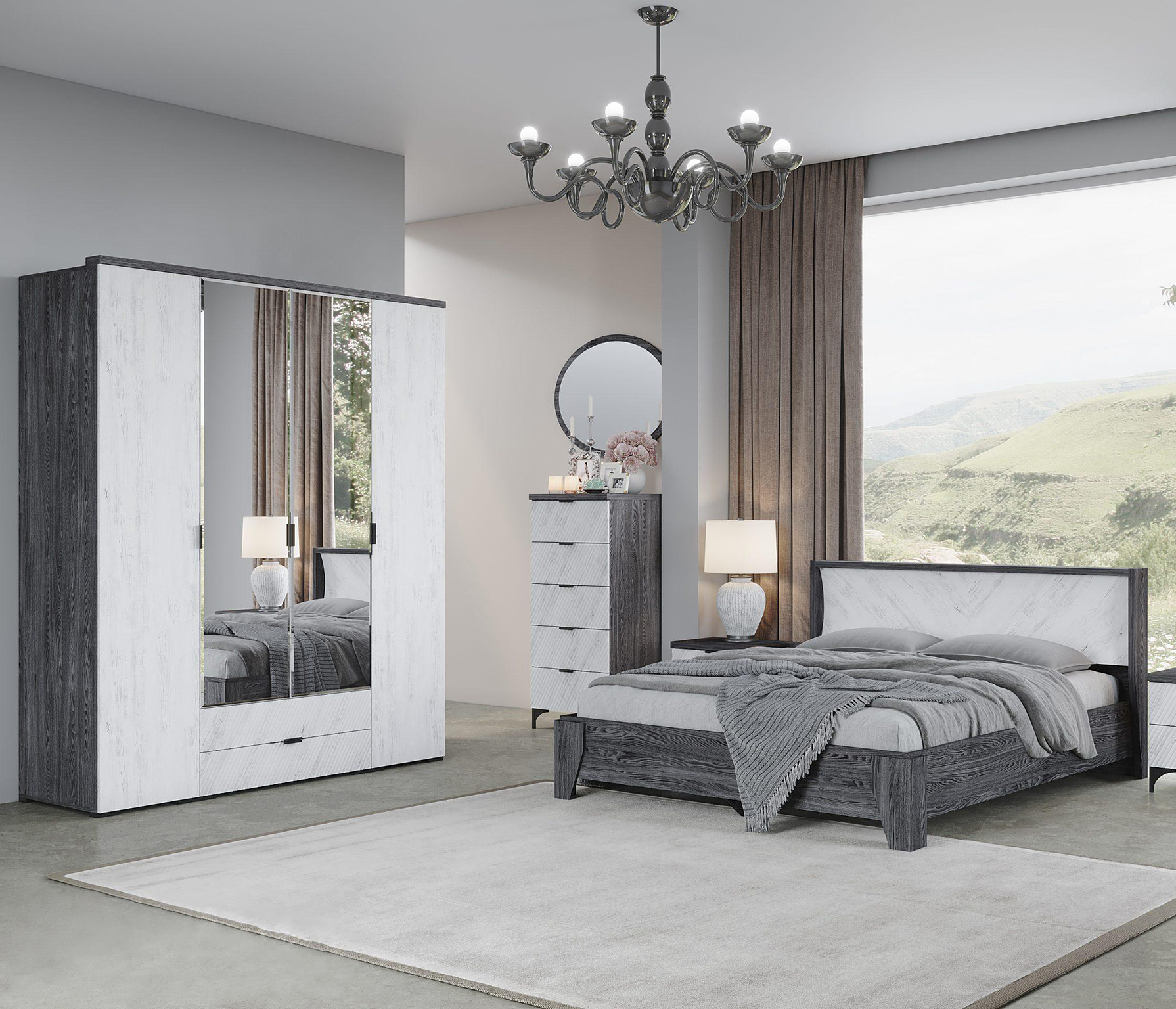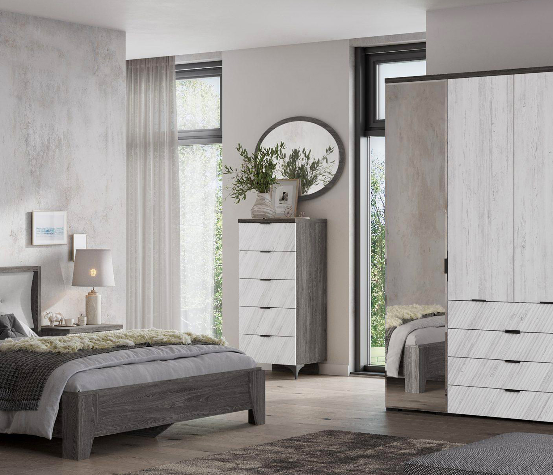 Новые современные цвета: черный ясень — это глубокий серый, легкий и одновременно динамичный цвет в сочетании с санторини белым — цвет с древесными линиями, создающими гармоничный контраст, наполняя пространство воздухом и природной энергией.