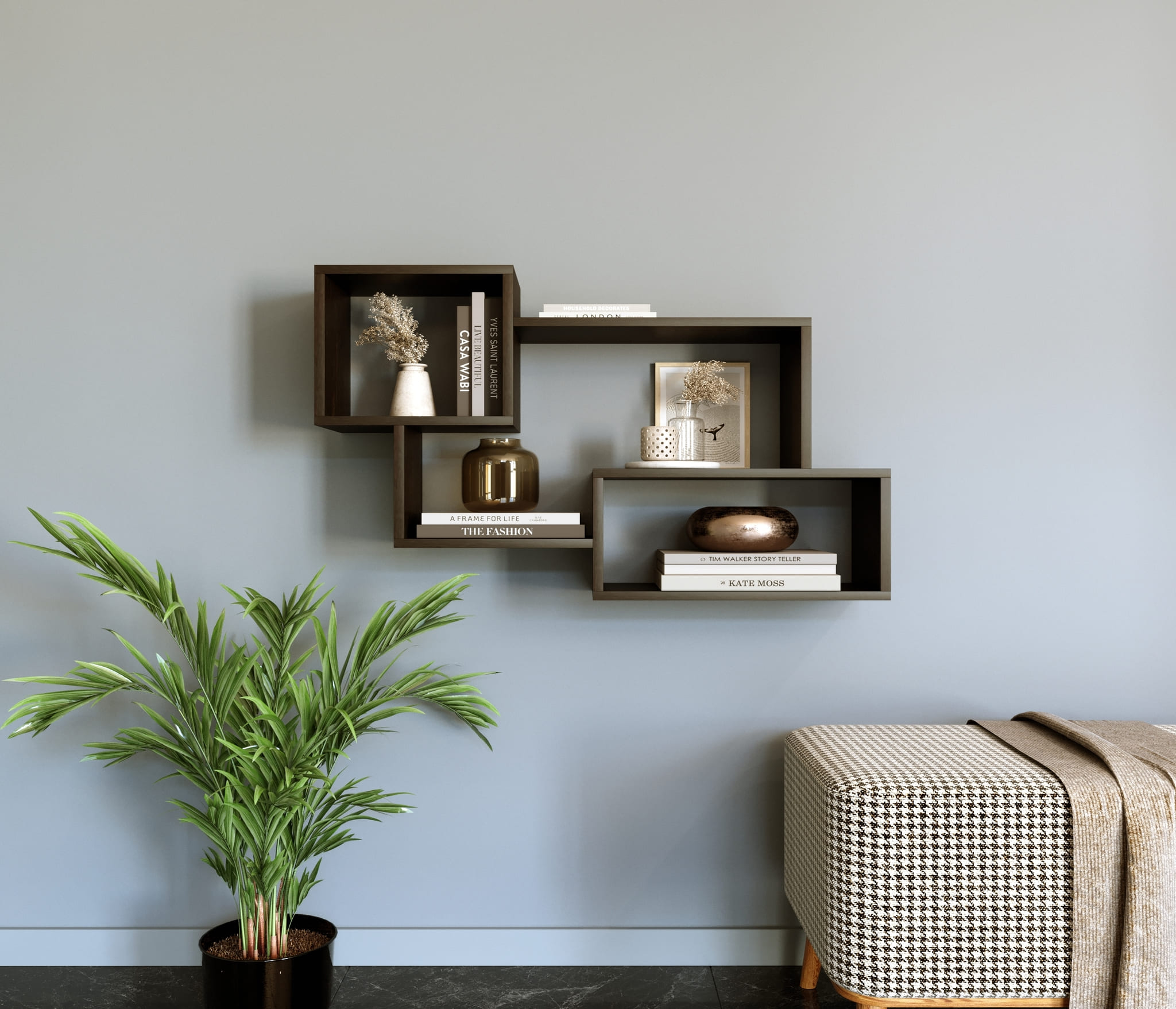 Полка настенная П-7 изготовлена из ламинированной ДСП 16 мм..Высотой 1070 мм,шир 650 мм и глуб 270 мм имеет 3 отсека различной формы для хранения разных вещей.