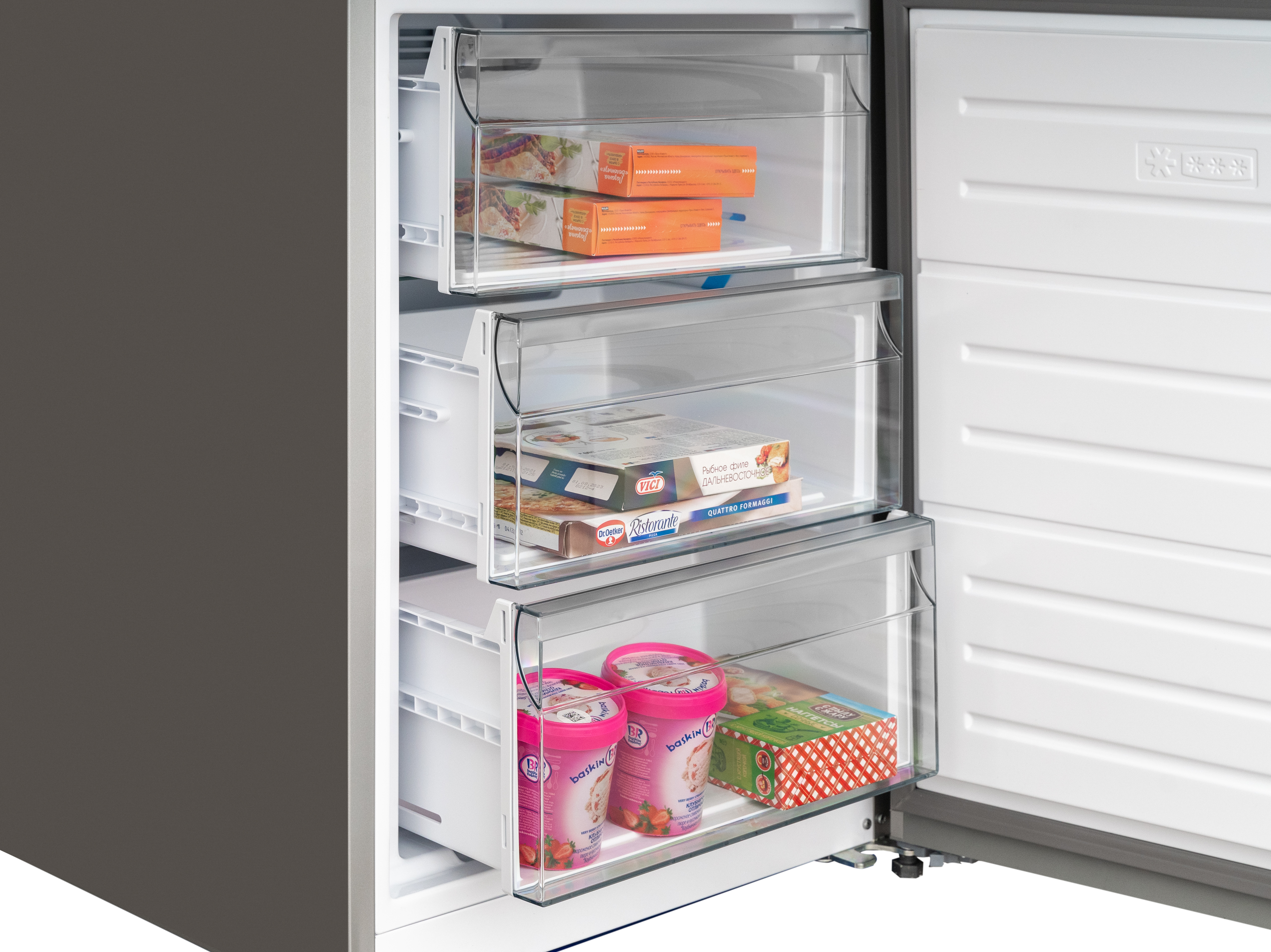 Ящики в морозильной камере глубокие и прочные, дают возможность замораживать продукты большого объёма.