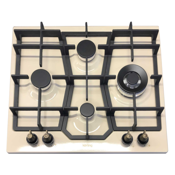 Газовая варочная панель 60см в ретро-дизайне, 4 высокоэффективные конфорки, WOK- сверхмощная конфорка, автоматический электроподжиг, газ-контроль каждой конфорки, передние переключатели, чугунные решетки, адаптер для WOK-конфорки, цвет - слоновая кость, цвет ручек - бронза.