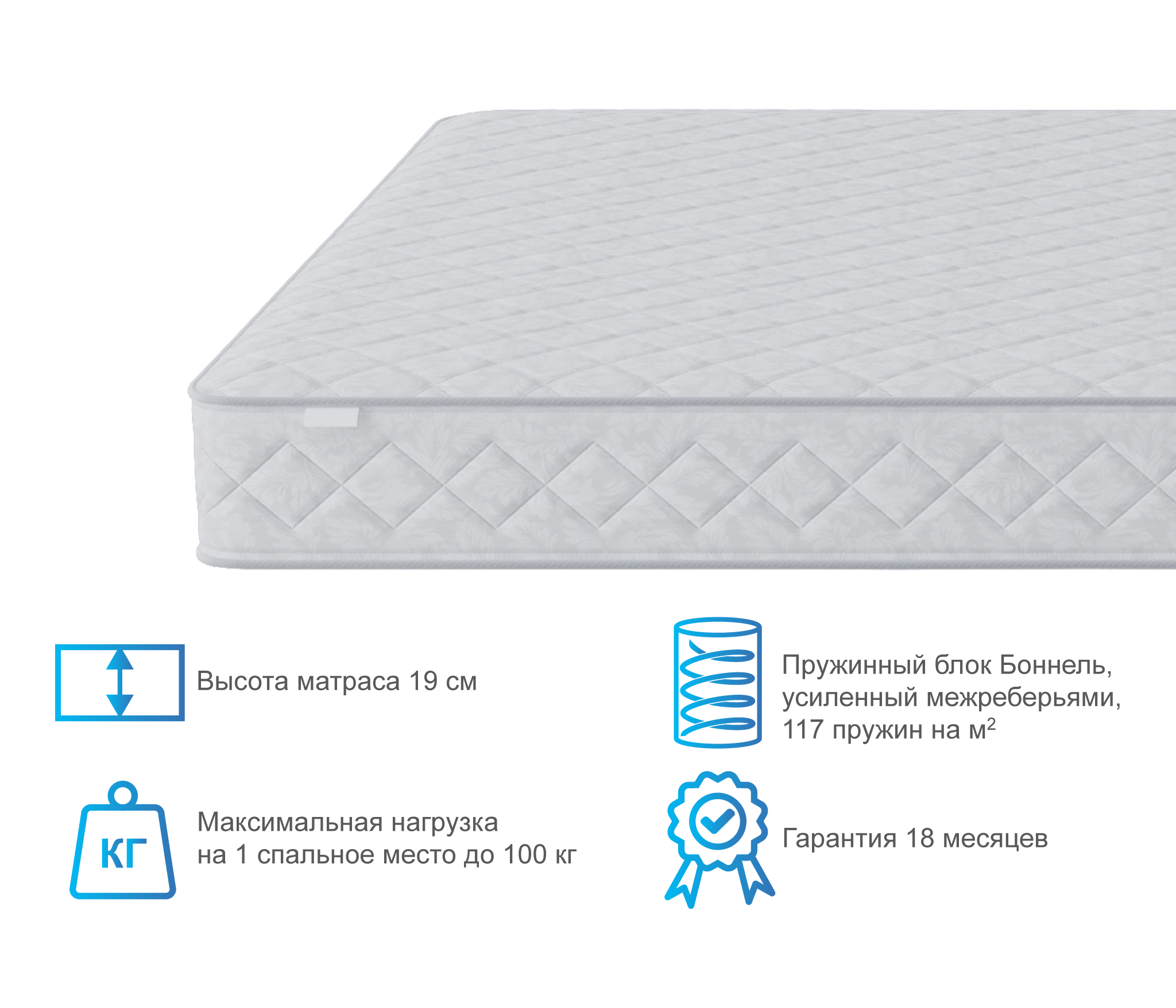 Матрас высокой жесткости с усиленным пружинным блоком Боннель . Усиление достигается за счет вставок из пенополиуретана. Данный матрас рекомендуется для людей с повышенной массой тела.