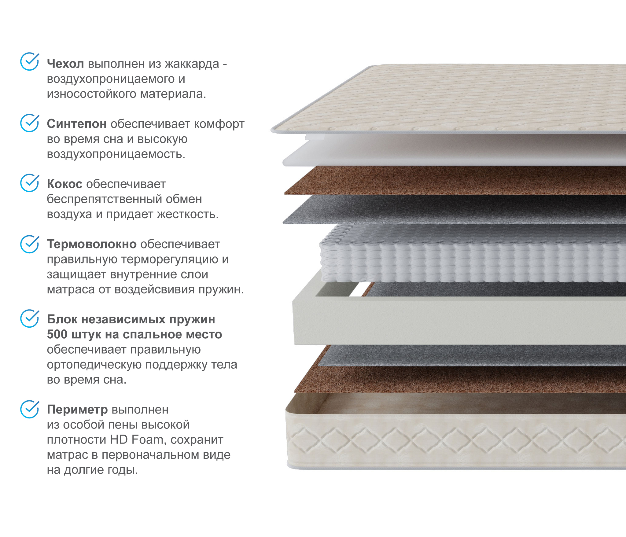 Благодаря кокосовой койре, этот матрас обладает средней жесткостью, а также высокой износостойкостью.