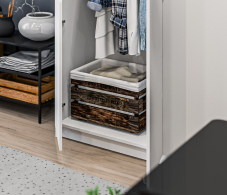 Шкаф имеет четыре полки и штангу для удобного хранения различных типов одежды. Шкаф не имеет ручек и обладает современным и минималистичным дизайном, который легко сочетается с различными интерьерами.