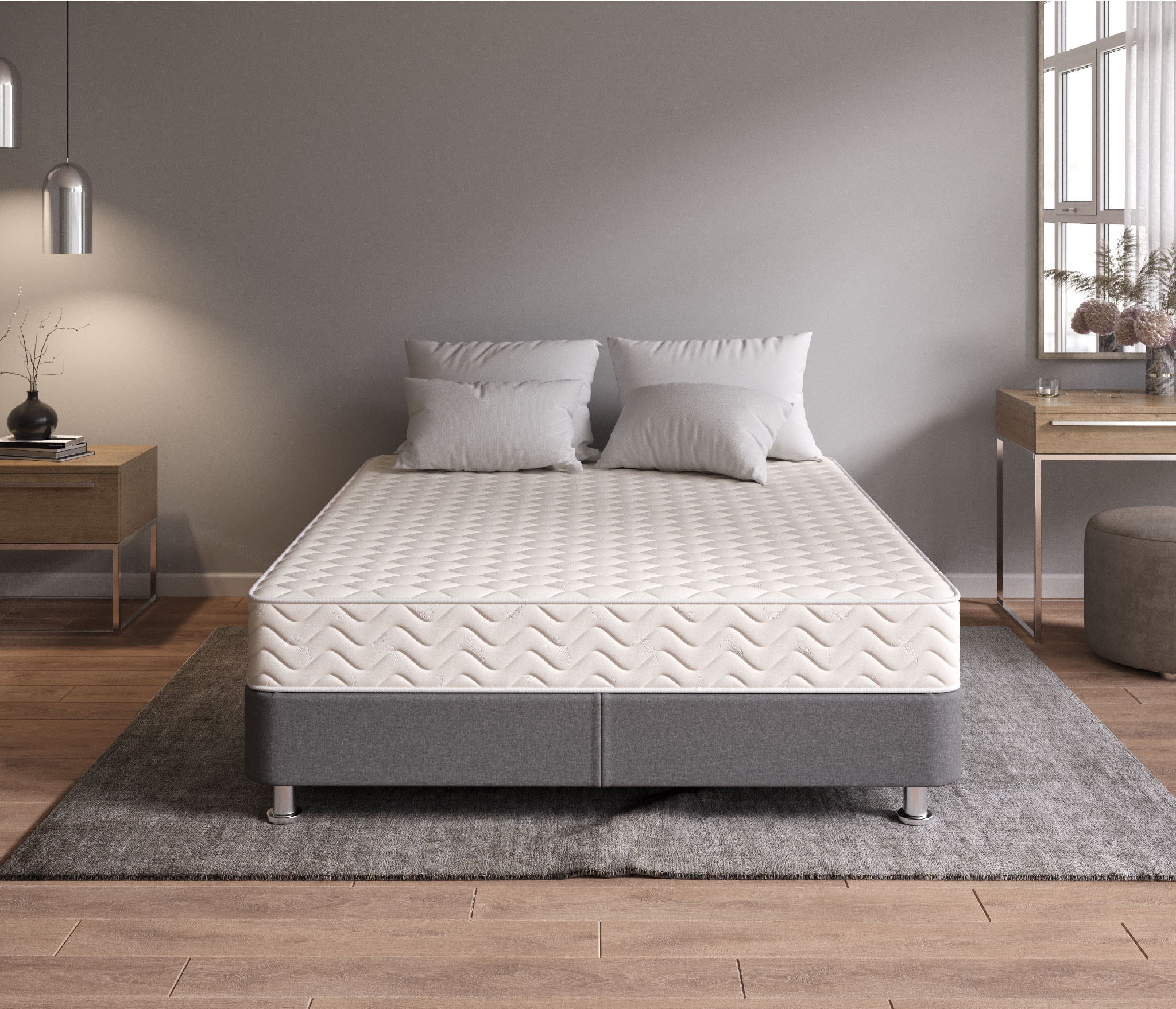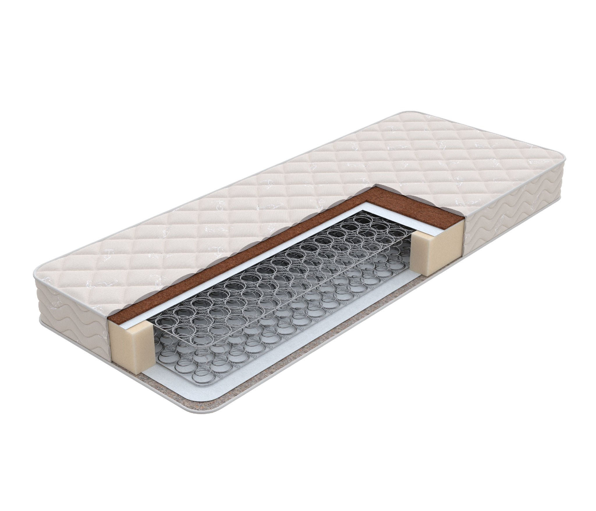 Основой служит зависимый пружинный блок Боннель. В нем все конусные стальные пружинки (126/м2) соединены между собой и скреплены при помощи специальной рамы. Изделие способно выдерживать высокие нагрузки. Над блоком в 1см расположена латексированная кокосовая койра. Это покрытие на основе жестких кокосовых волокон, но смягченных натуральным латексом. Наполнитель улучшит осанку, поддержит корсет из мышечной ткани.