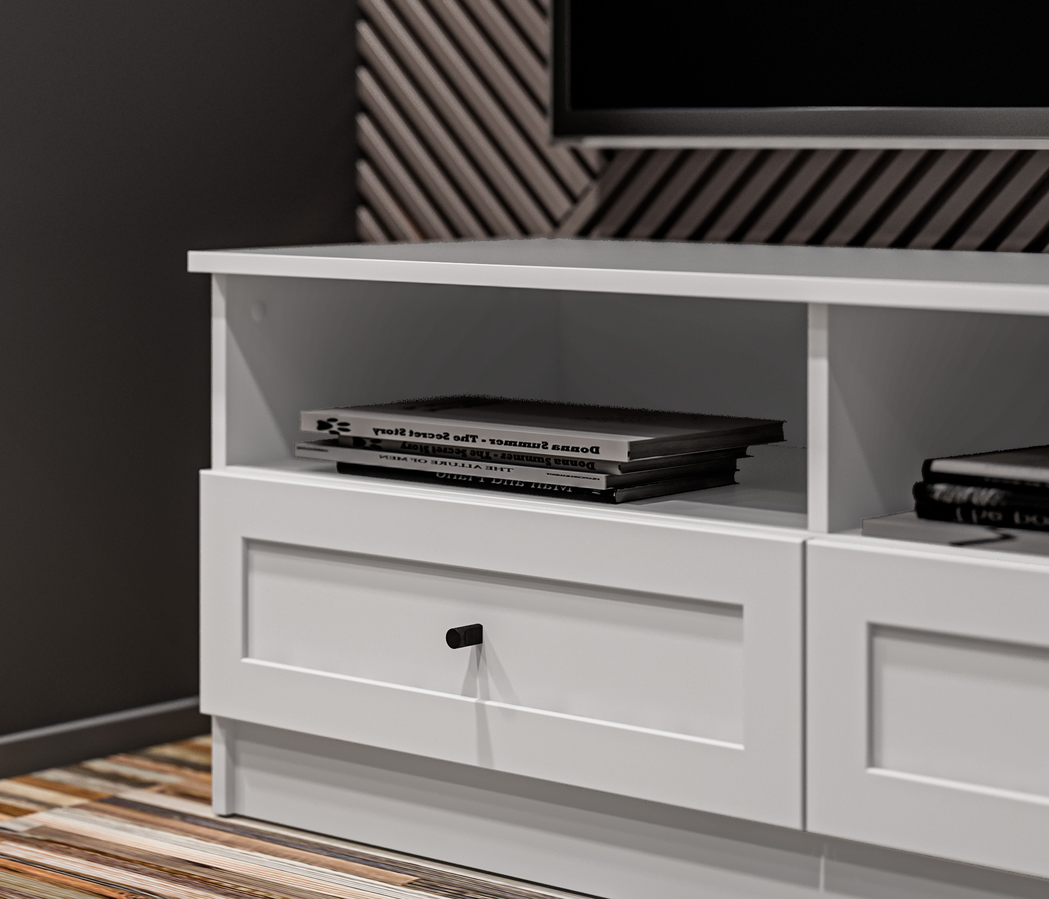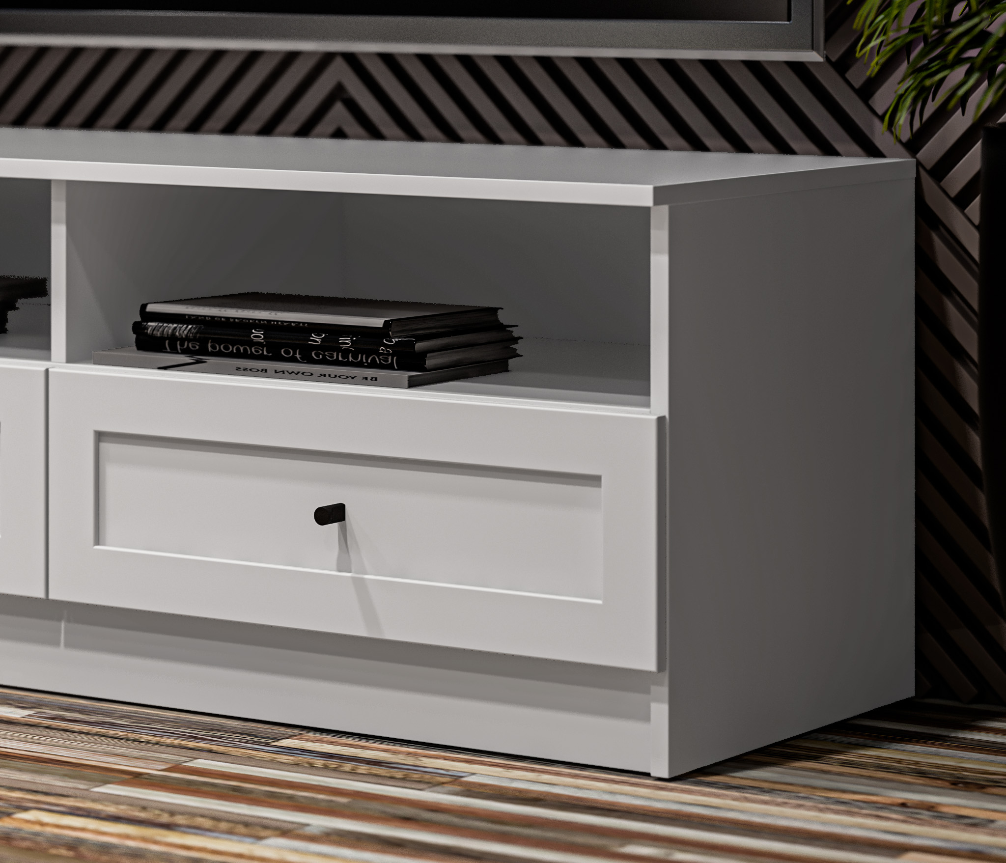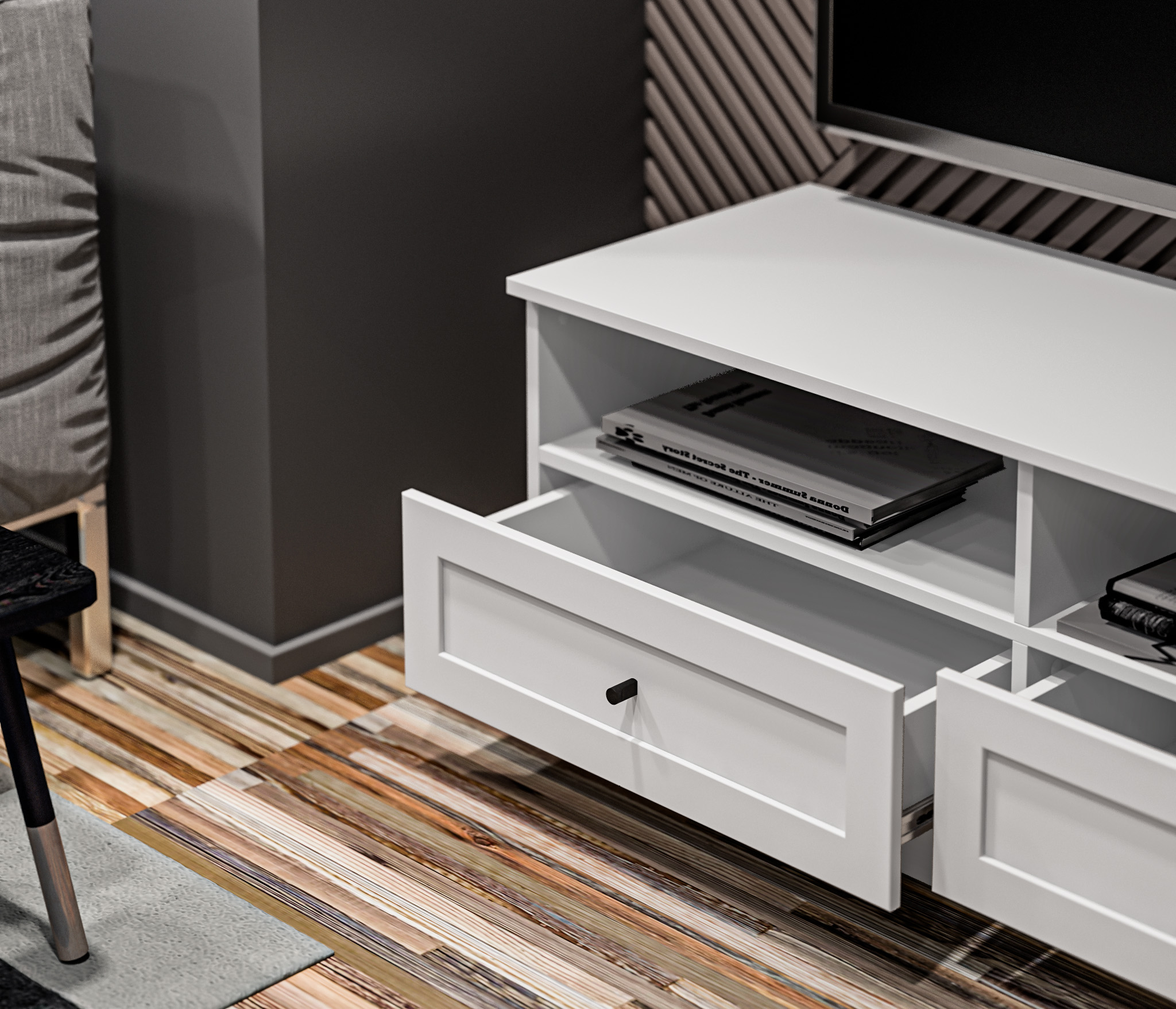 Продуманные детали делают использование тумбы максимально удобным: шариковые направляющие обеспечивают плавное выдвижение ящика.