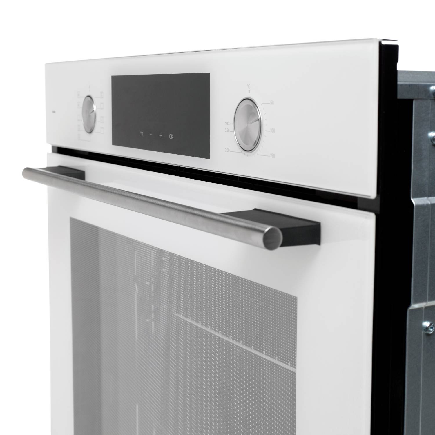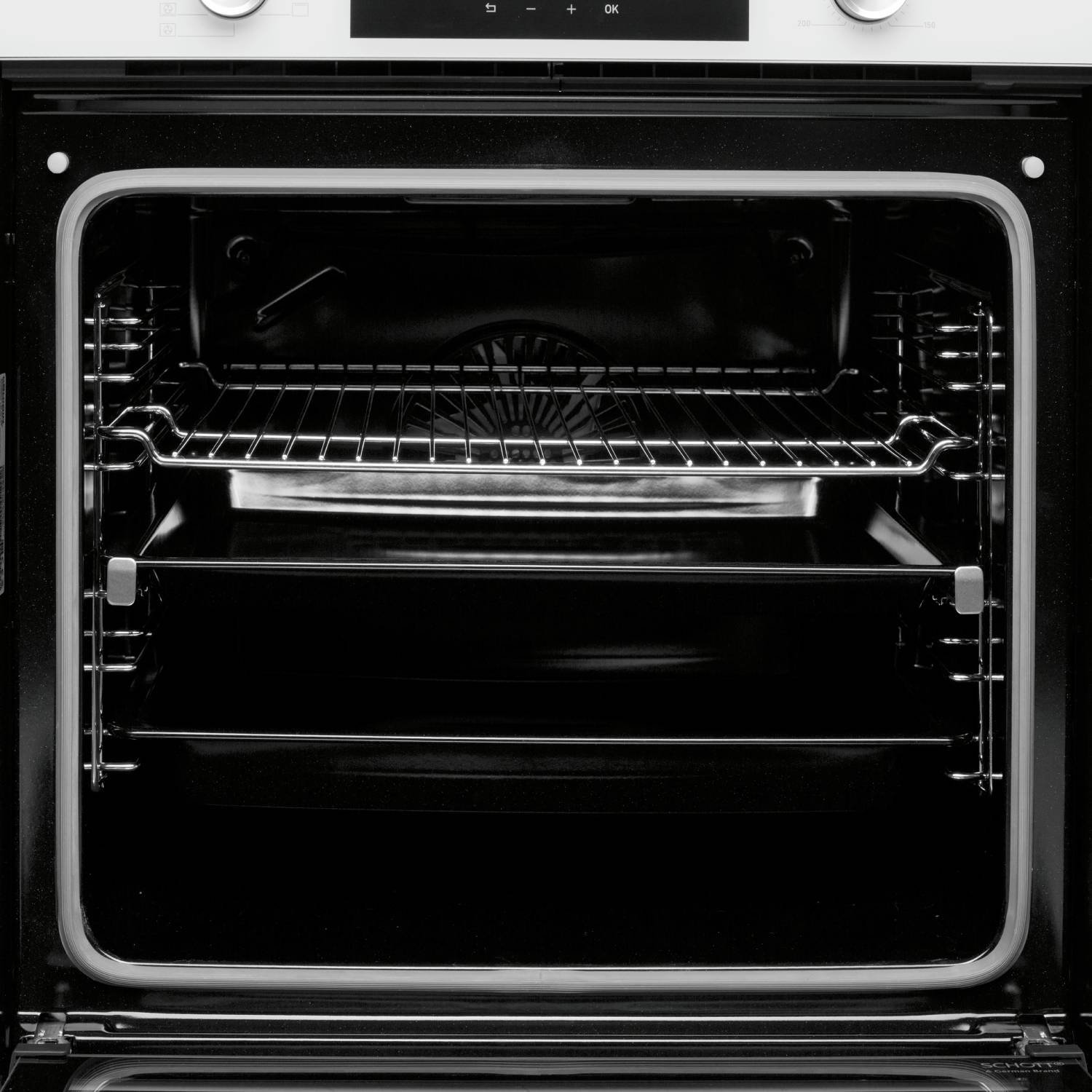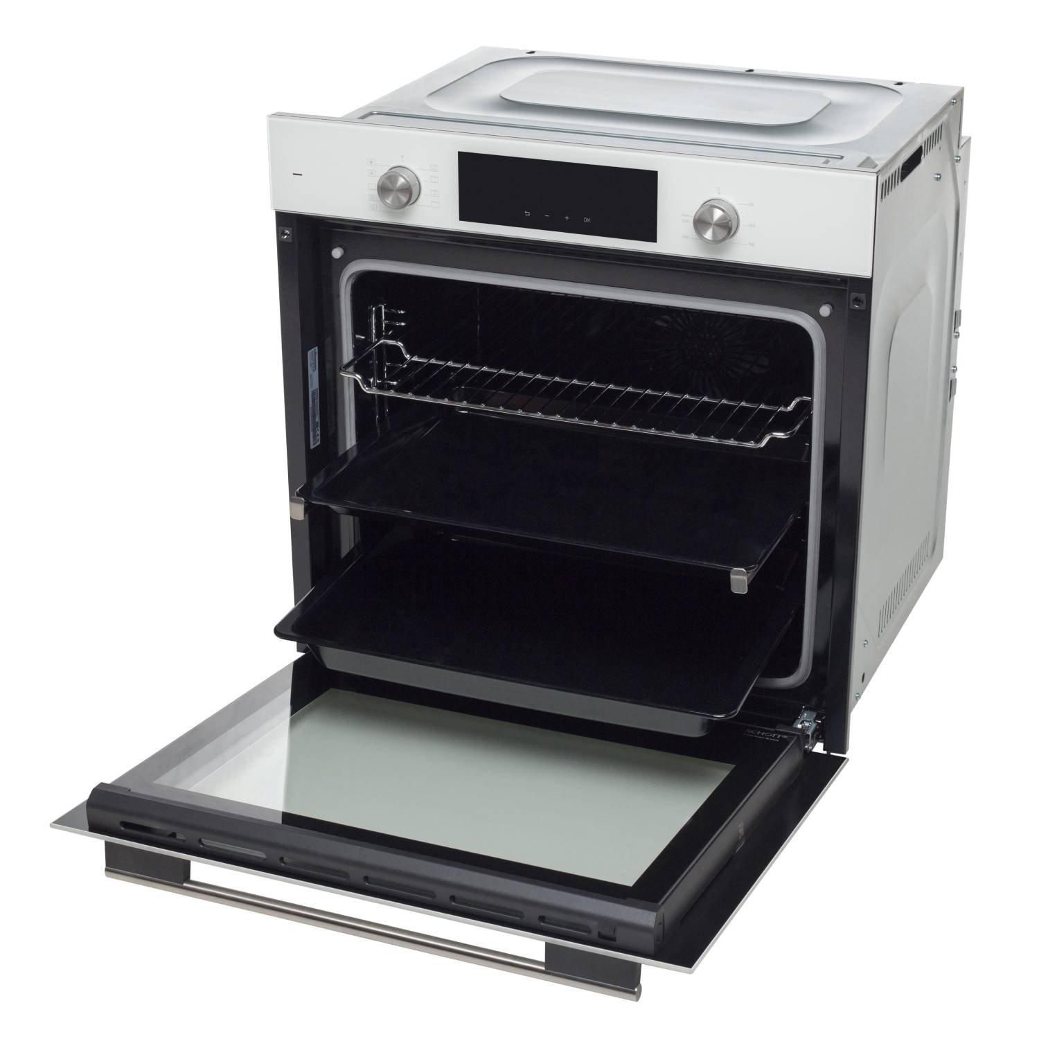 • Материал фасада: Узкая стеклянная панель управления + стеклянная дверца духовки из кристально белого стекло от немецкого производителя Schott Ceran