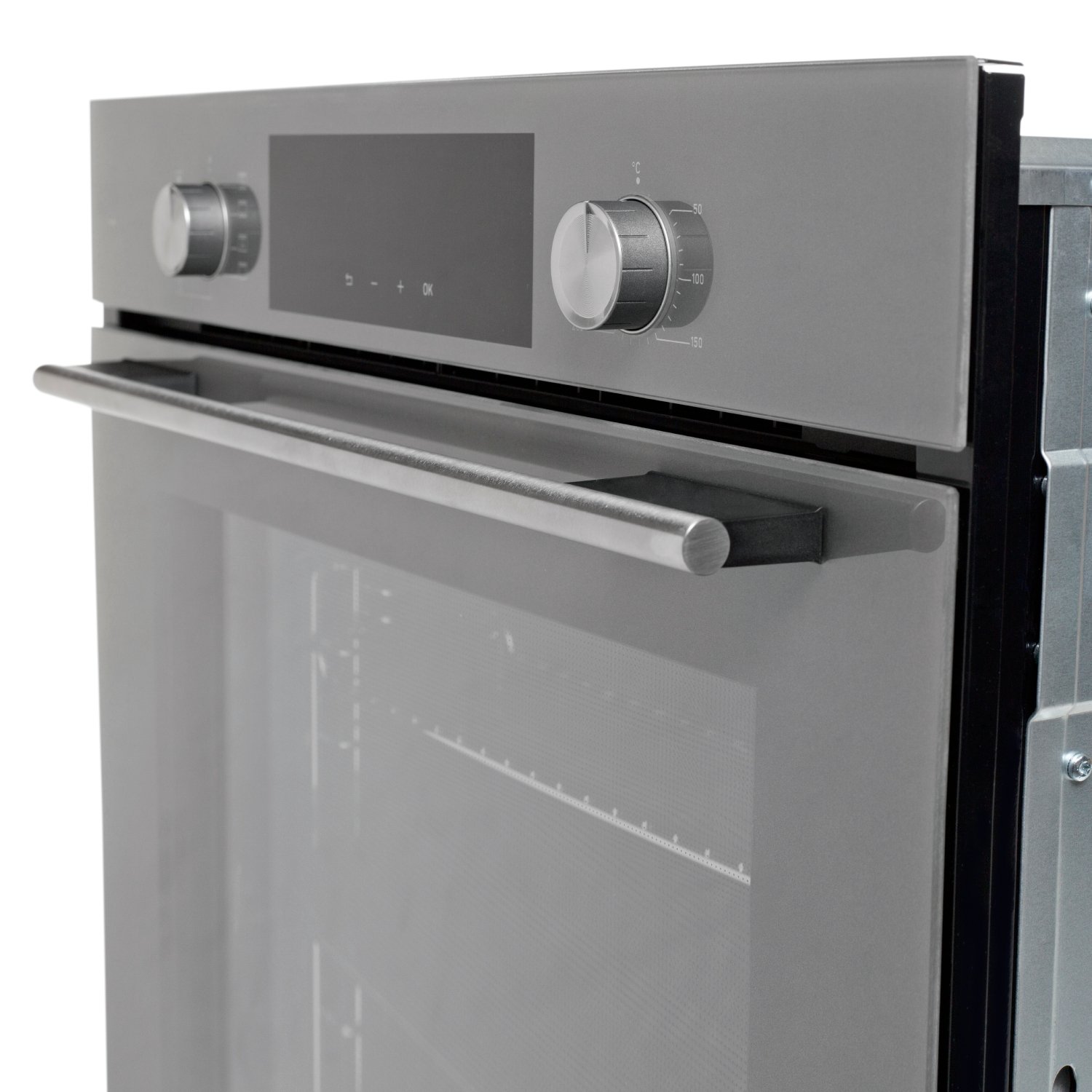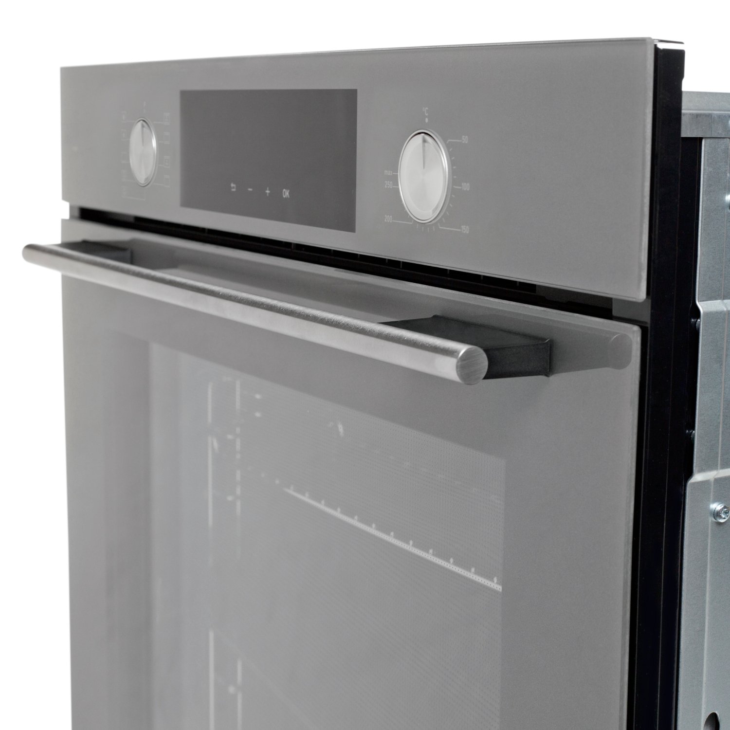 • Материал фасада: Узкая стеклянная панель управления + стеклянная дверца духовки из чистого серого стекла от немецкого производителя Schott Ceran