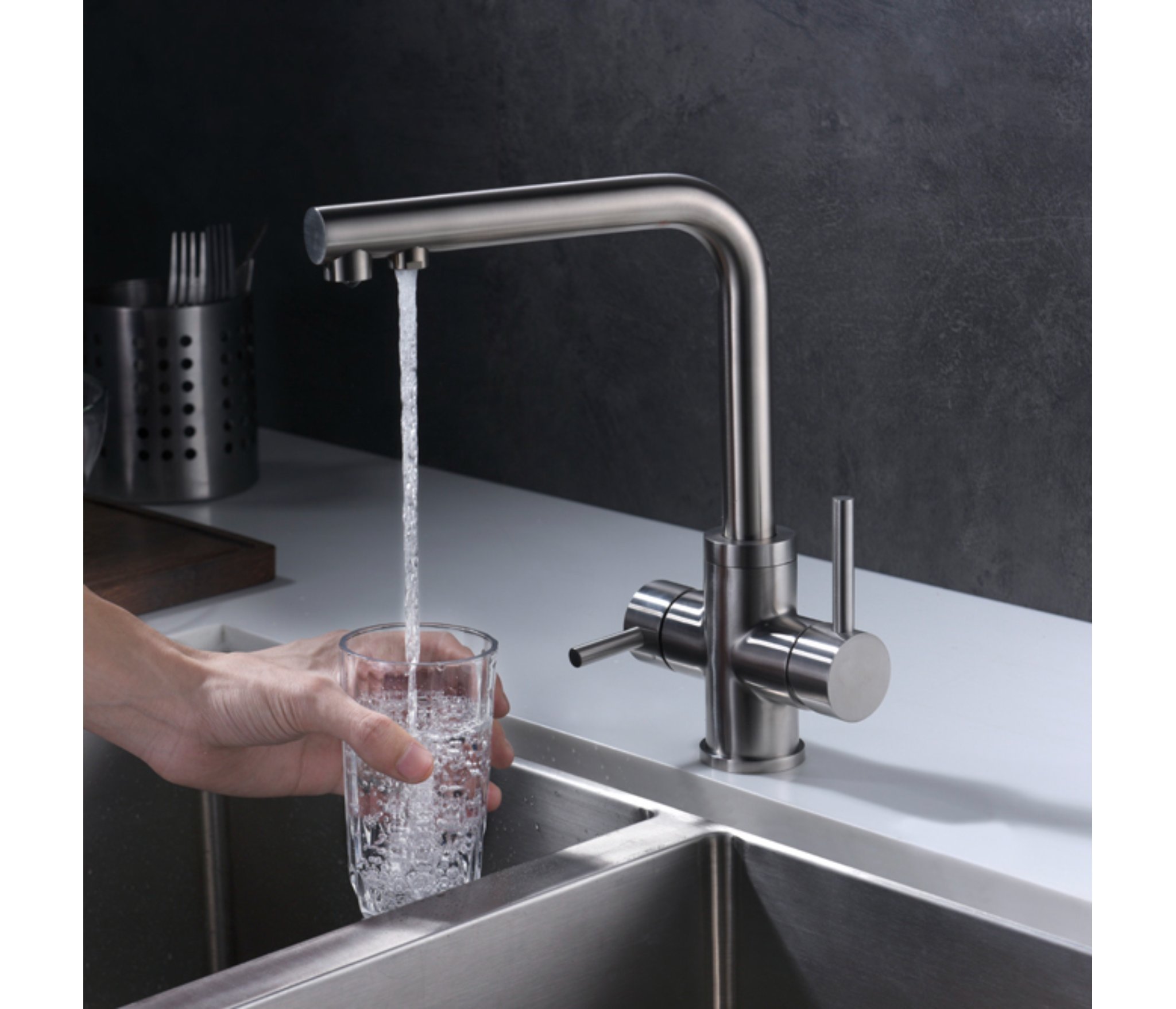 Смеситель обладает основной ручкой для подачи проточной воды и дополнительной ручкой для подачи воды из питьевого фильтра. Подключение к фильтру очистки воды стандартное.
