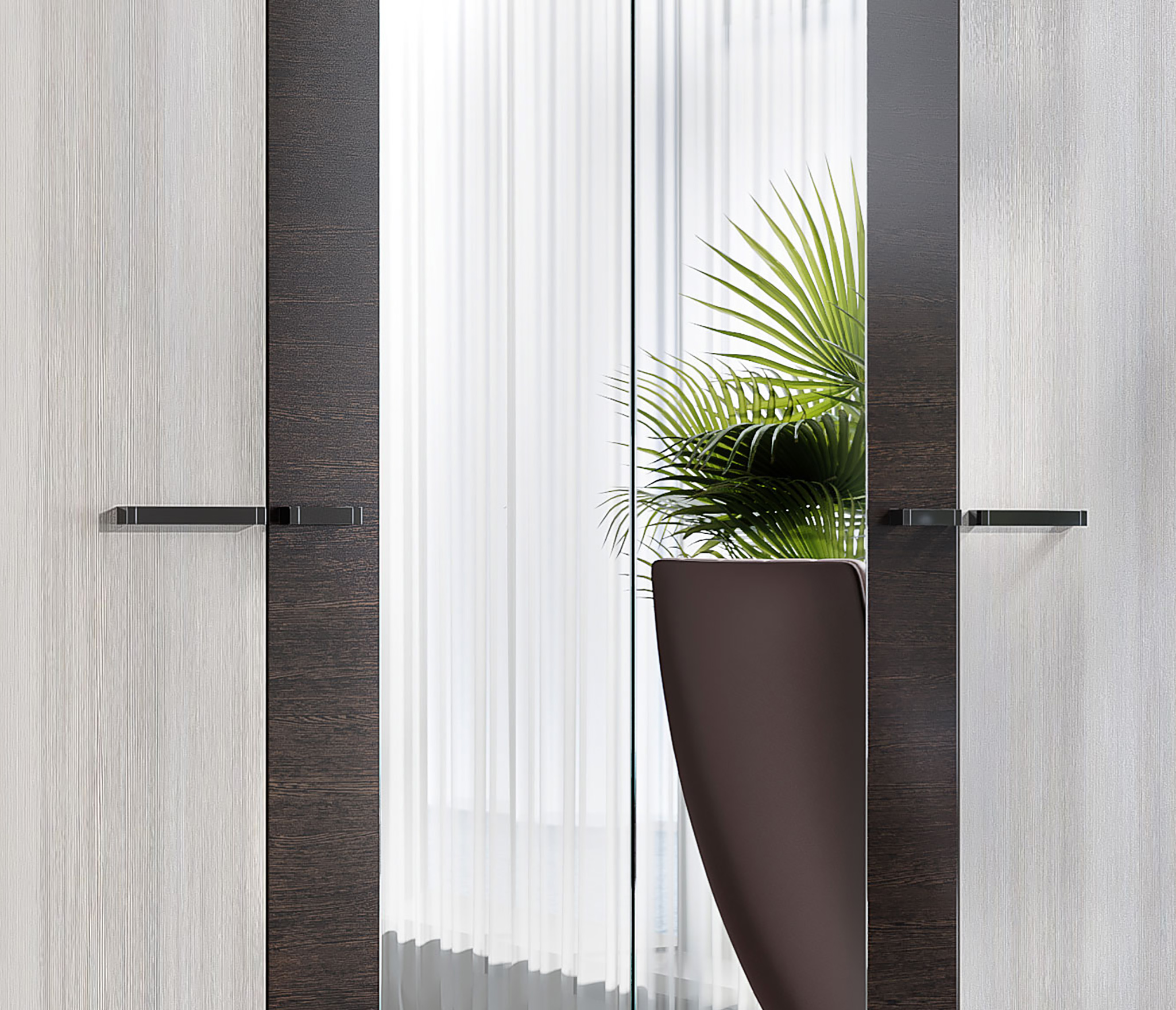 Распашной шкаф Адель включает две продольные штанги для плечиков, а также два выдвижных ящика для белья и аксессуаров. Два зеркала в полный рост.