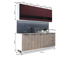 Кухонный гарнитур Астра длиной 2 метра подойдёт как для малогабаритной кухни, дачи, так и для небольшой кухни-гостиной. Кухня выполнена в стиле модерн и органично впишется в современный интерьер. Верхние фасады в цвете насыщенного бордо символизируют власть и силу, целеустремленность и уверенность. Нижние фасады с текстурой благородного дуба дополнят смелую кухню брутальностью. Распашные шкафы и выдвижные ящики вместят всю необходимую посуду, кухонную утварь и продукты. С рабочим пространством 1200*600 мм вы почувствуете себя настоящим шеф-поваром.